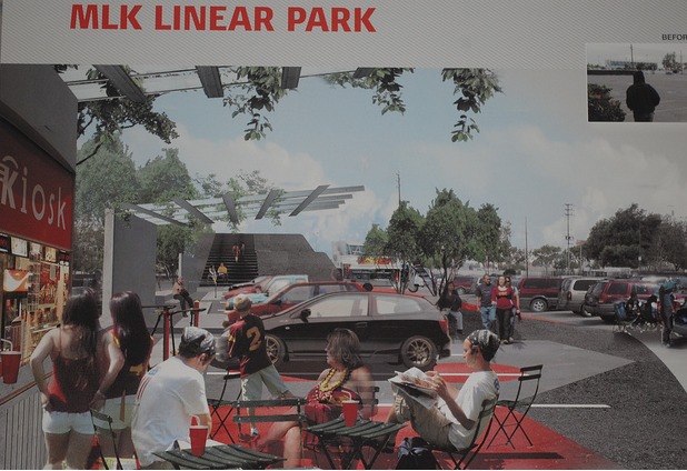 For 11th street, Schultze proposes closing the segment to all traffic besides local traffic and deliveries by creating a “Paseo” as seen above. Bill Robertson Boulevard would undergo a similar treatment, with the north end being closed completely and the south area turning into an adjacent “Olympic Park.” As for MLK Boulevard, the team determined that the amount of car traffic would make reducing the travel lanes a more difficult proposal, but that other treatments could still transform the area. In the above image, the project team unveils a linear park proposal that manages to keep most of the parking and still creates a different, more public, feeling for the space.