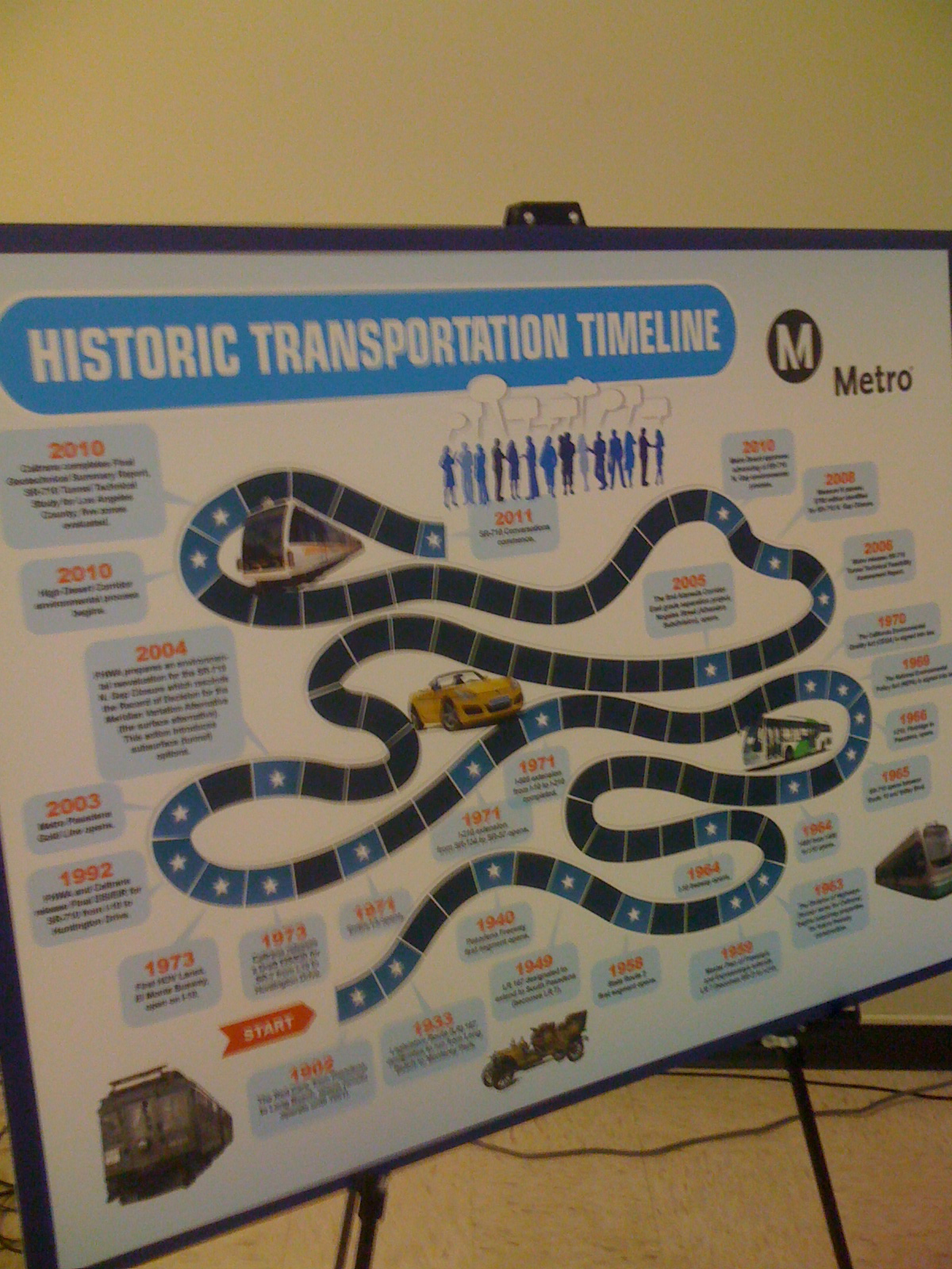 It seems suggestive that Metro and Caltran’s just launched SR-710 Conversations public outreach process features a timeline of transportation milestones printed as a board game. It remains to be seen whether it will be a game that the public plays: a creative rethinking of mobility needs in the San Gabriel Valley and Northeast Los Angeles, or a game that plays the public: going through the motions of input on environmental studies for a 710 ‘gap closure’ tunnel that agencies intend to pursue regardless of any alternative proposals.