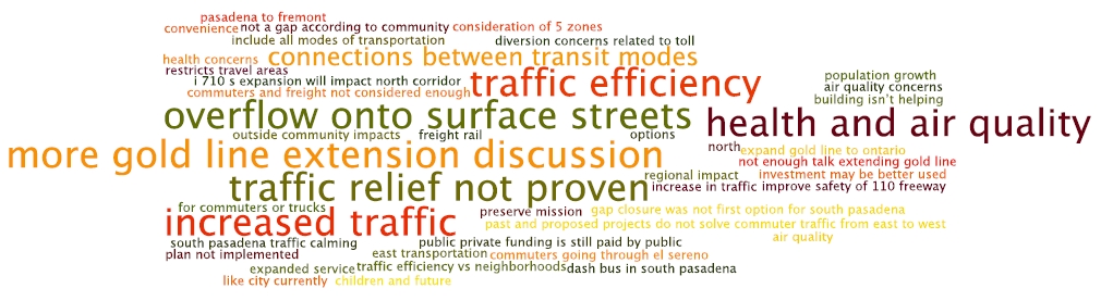 People in my breakout group were concerned about heavy traffic on surface streets (on Fremont Ave in particular). No one jumped to the conclusion that we need to increase capacity via an extension of SR-710. Our considerations list was heavy of ways to encourage people to use transit, improve and expand transit, and make streets safe to walk and bike. Meeting organizers have helpfully posted word clouds from breakout group notes on facebook, showing that across all breakout groups, the most discussed solutions were ‘better planning and development,’ ‘better and more accessible public transportation’ and ‘consider alternative modes of transportation.’