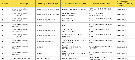 Earlier this week, Transportation for America released a report on the state of America’s bridges. Capitol Hill Streetsblog broke down those numbers yesterday, but the numbers for California were even worse. According to “The Fix We’re In For: The State of California’s Bridges,” 11.8% of California bridges are “structurally deficient” and this figure will continue to rise as an entire generation of bridges approaches their 50-year life expectancy. Additionally the top ten most heavily traveled structurally deficient bridges in the nation are in the greater Los Angeles region.