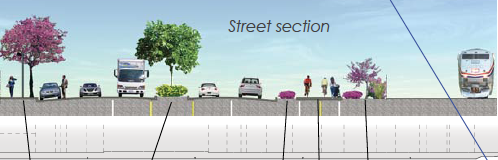 While the street scaping is designed to make the business area more attractive to cyclists and pedestrians to visit the shops, there are many other benefits to the project. The trees on the far left will create a buffer between the “car area” of the street and the pedestrian area. All of those plantings will also act as traffic calming, slowing down traffic and making the street safer. While the bike area is clearly designated a path because cyclists will only be able to access the shops on the south side of the road at certain intersections; visually it looks awfully similar to a separated bike lane.