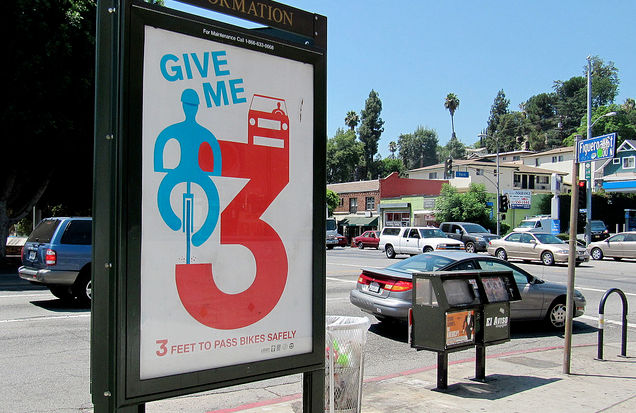 Last summer, a coalition of bicycle groups and the City of Los Angeles joined forces to create the “Give Me 3” public service announcement campaign to encourage drivers to give cyclists a larger berth when passing. Less than a year later, the California Bike Coalition (CBC) has launched its own “Give Me 3” website and campaign to build support for Senator Alan Lowenthal’s (D-Long Beach) Senate Bill 910. S.B. 910 would create a state 3 foot passing law for California. Los Angeles Mayor Antonio Villaraigosa remains personally committed to enshrining a passing law in the California Vehicle Code.