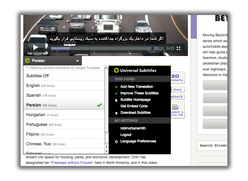 It’s super easy to use, fits nicely into our website and will improve access to the issues Streetfilms covers. We’re using our series, Moving Beyond the Automobile, as a test case for this new feature, and thanks to a handful of dedicated Streetfilms fans and the great crew at Universal Subtitles, MBA: Highway Removal has already been translated into nine languages! We encourage you to give this feature a whirl using the videos in Moving Beyond the Automobile, but all videos on the website are ready and waiting to be subtitled.