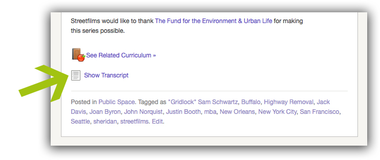 - Every video on the Streetfilms website supports Universal Subtitles. However, most videos that are not part of the Moving Beyond the Automobile series do not have English subtitles applied to them yet. Applying English subtitles to a video is a useful first step in the translating process because it acts as a guide for timing when translating into other languages. The best way to add the English subtitles is to copy and paste the text from the video’s transcript. You can locate a video’s transcript by clicking on the “Show Transcript” button below each video in its individual page view.