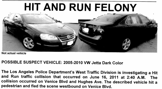At nearly 3:00 A.M. on the morning of June 16, a man was crossing Venice Boulevard heading North when he was struck by a black late-model Volkswagon Jetta heading west. The victims wife tells the story: