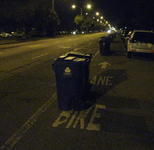 The bureaucratic pontificating by the LADOT, Street Services, Sanitation, the LAPD and anyone else with a piece of the street has failed to improve the situation in the least. Their collective incompetence has failed to even result in reflective markings on the dark cans so that cyclists are less likely to hit them in the dark.