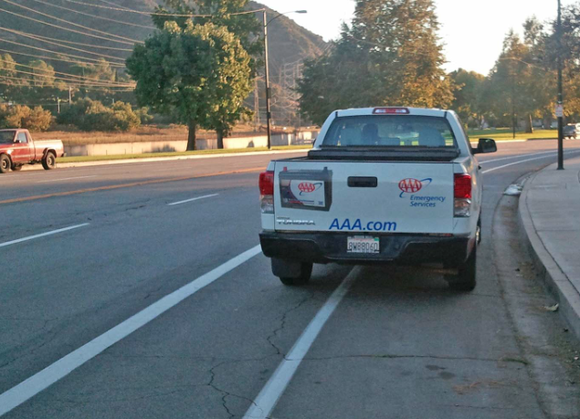 The AAA driver parked in the Bike Lane above is probably making a quick call to Sacramento, thanking Governor Brown for vetoing SB 910, the legislation which would mandate a minimum three foot distance for motorists passing cyclists when the speed is greater than 15 MPH.