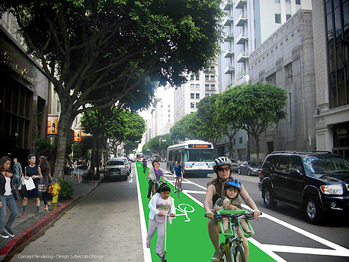 Valerie Watson, the At-Large Director of DLANC (Downtown LA Neighborhood Council), who has been heavily involved with making the Historic Core in Downtown LA a much more pedestrian and bike friendly community, sends me this rendering (and more info) of a fully separated bike lane down Spring St that will also be painted green (like those coveted ones in bike-friendly Portland or New York).