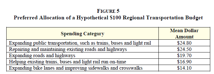 Many of those 18 million people are tired of the long commutes, tired of the endless highway spending, and anxious for a new way of looking at transportation. Survey respondents were asked to imagine they were in charge of their region’s transportation budget, and to allocate a hypothetical $100 budget across five spending categories. Their responses indicate they would like to see a significant majority of the region’s transportation dollars allocated to expanding and improving public transportation and providing more bike and pedestrian infrastructure. While voters would allocate about 25 percent of funding to repair and maintain existing roads and highways, they would allocate less than 20 percent of the budget to expanding roads and highways.