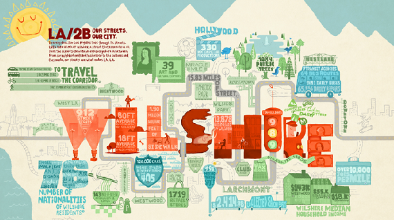 But Angelenos know how important the street is. The above graphic was created by local artist and designer Brian Micheal Gossett as part of the outreach for the LA/2B program. The Los Angeles Departments of City Planning and Transportation (LADOT) partnered with GOOD Corps, to create an interesting and interactive experience for people to participate in the process of creating a new mobility plan for the city, and this infographic shows how streets do more than just transport us from A to B.