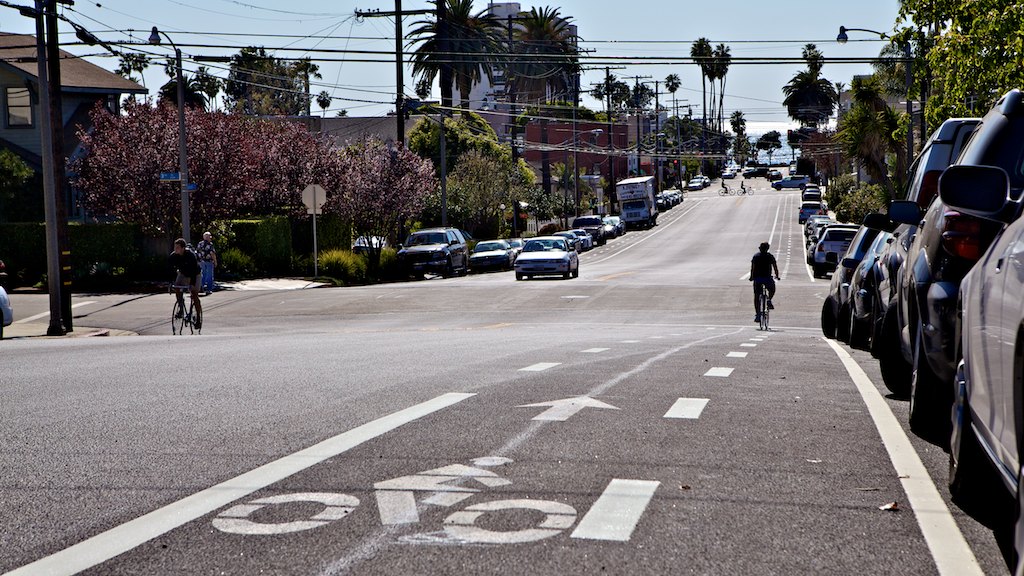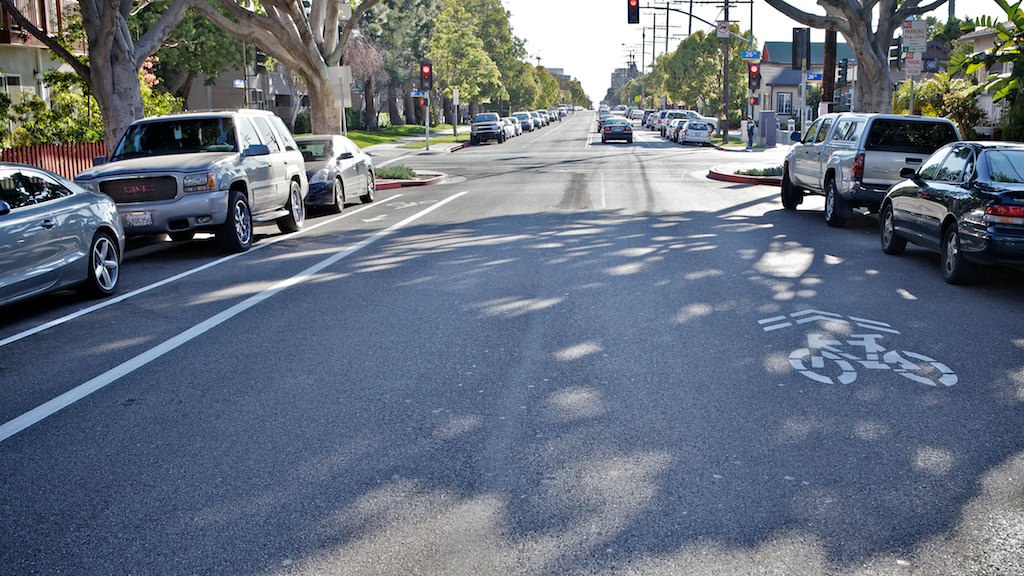 The latest reconfigurations of street space that I’ve spotted include the introduction of two new bike lane types not used in Santa Monica prior to the adoption of the new Bike Action Plan (pdf). The first is a climbing lane, which is a treatment that incorporates a bike lane in one direction, the one with the most elevation gain, and sharrows on the opposite side. This allows a bike rider to have dedicated space when they are at their slowest, and are reintegrated with traffic on the down slope, where they are able to keep a faster pace more comparable to cars on neighborhood streets. On streets that are too narrow to include bike lanes in both directions, climbing lanes are a way to fit in more than just sharrows. This configuration also slightly constrains the space for driving, which has a traffic calming affect since drivers must exercise more caution in passing each other.