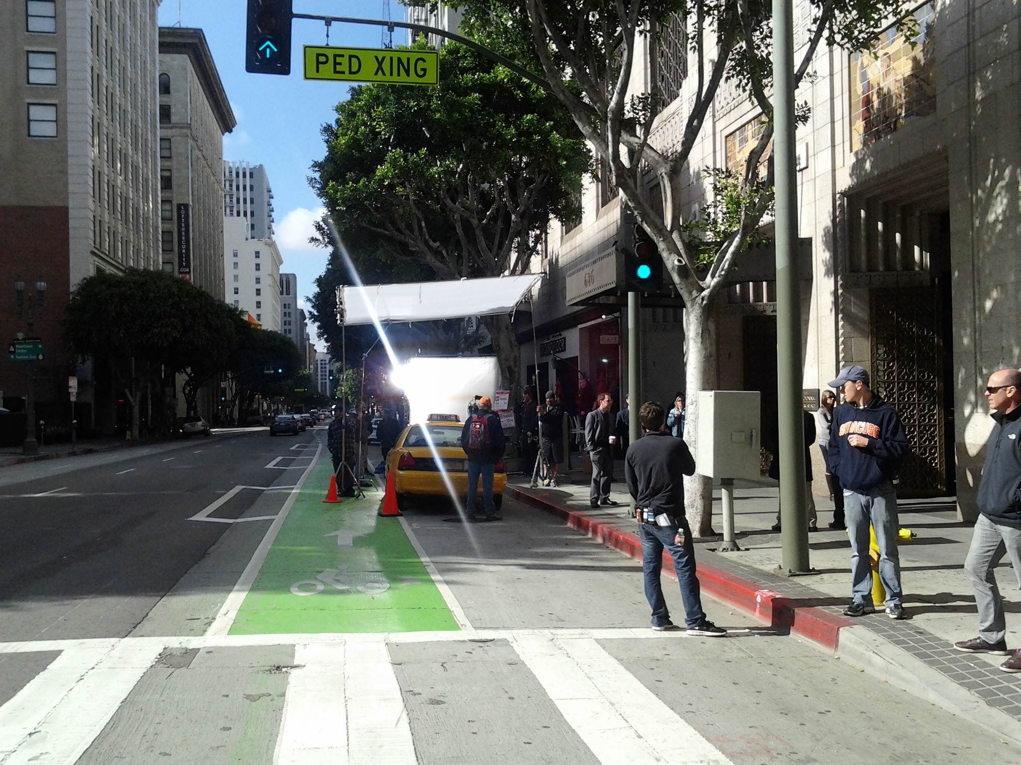 But let’s give the crew from Ringer and the LADOT some credit. Perhaps there was a miscommunication. Despite the desires of Film L.A., the city does not give out permits to close a travel lane for the parking of film crew vehicles unless the shoot is so large that adjacent parking lots cannot accommodate the crew’s vehicles. This holds true for regular through travel lanes or green buffered bike lanes. If you look at the picture above, the reason for the bike lane closure is not crew parking, but the equipment needed for whatever shot it was they were trying to film.