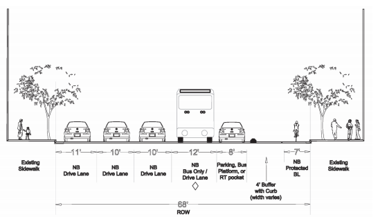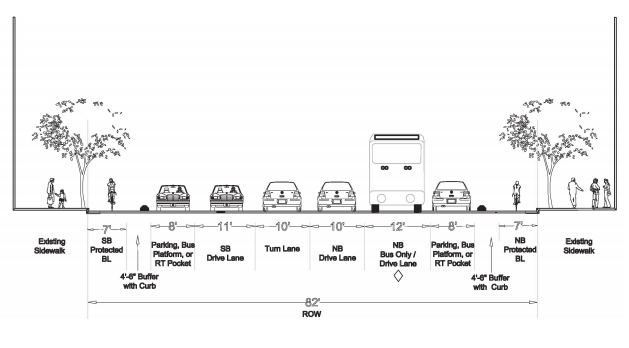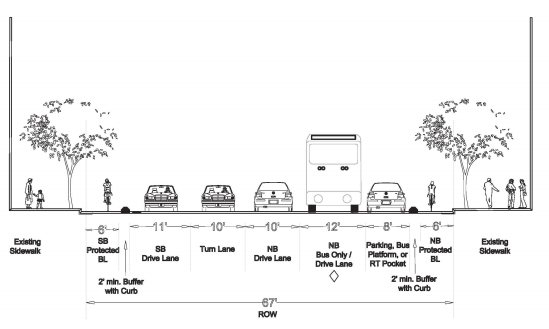 There’s good news and bad news. The bad news: it looks like “better” and “best” are off the table. The good news? “Good” still includes a transit only lane and a pair of bike only lanes. The northbound bike only lane and separate transit only lane run the entire 3 mile route of the project from 7th and Figueroa to MLK Boulevard. The Southbound bike only lane starts at 10th Street and goes all the way south.