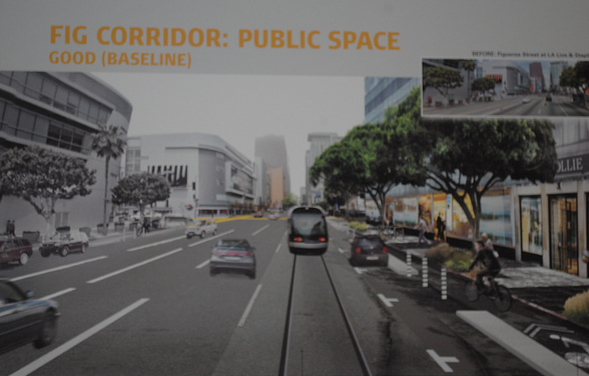 In January 2011, consultants for the South Figueroa Corridor Project unveiled three different visions for the soon-to-be Living Street. The visions were labeled “Good,” “Better,” and “Best.” A recent presentation to Caltrans, made available on their website, shows current thinking on the legacy project from the project team and the new lead agency, LADOT.