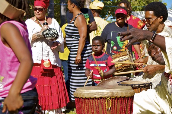 What I really love about the Leimert Park Art Walk is how public space is utilized to help put the focus on unity and community. You can perhaps feel that best in the drum circle, where the young, the old, the homeless, and the well-heeled celebrate music and dance together. Or in the warm and hearty handshakes with which community members greet each other in the streets. It is also evident in the art, which collectively often depicts a celebration of community, heritage, and empowerment. Ben Caldwell, director of the KAOS Network (the hub of the event), works to make art more participatory by offering free hands-on workshops and providing space for music and spoken word performances for all to enjoy and learn from. In short, the art is intended to be lived, not just observed.