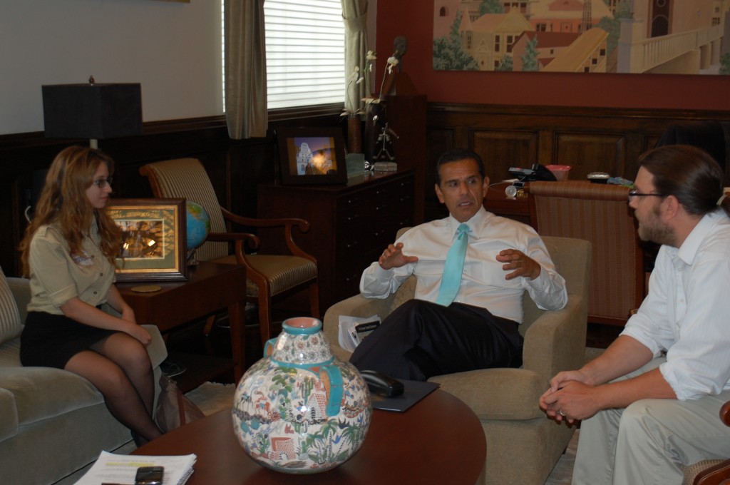 Earlier this month, Los Angeles Streetsblog editor Damien Newton and Streetsblog Lite editor Veronica Hernandez sat down with Los Angeles Mayor Antonio Villaraigosa for what turned out to be a long, far-ranging interview on all things transportation in Los Angeles. Originally scheduled as a chance to talk about the Mayor’s three terms as Chair of the Metro Board of Directors, the interview went long…very long. Villaraigosa clearly relished the chance to talk on a variety of transportation and development projects.