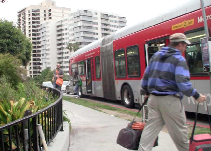 The race teams departed at 6:15. Representing bike riders everywhere was Austin Sos, a UCLA graduate student. Sahra Sulaiman walked for pedestrians, while I rode the Wilshire Rapid on behalf of transit riders everywhere. Mike Gran, a regular Wilshire Boulevard commuter took his truck.