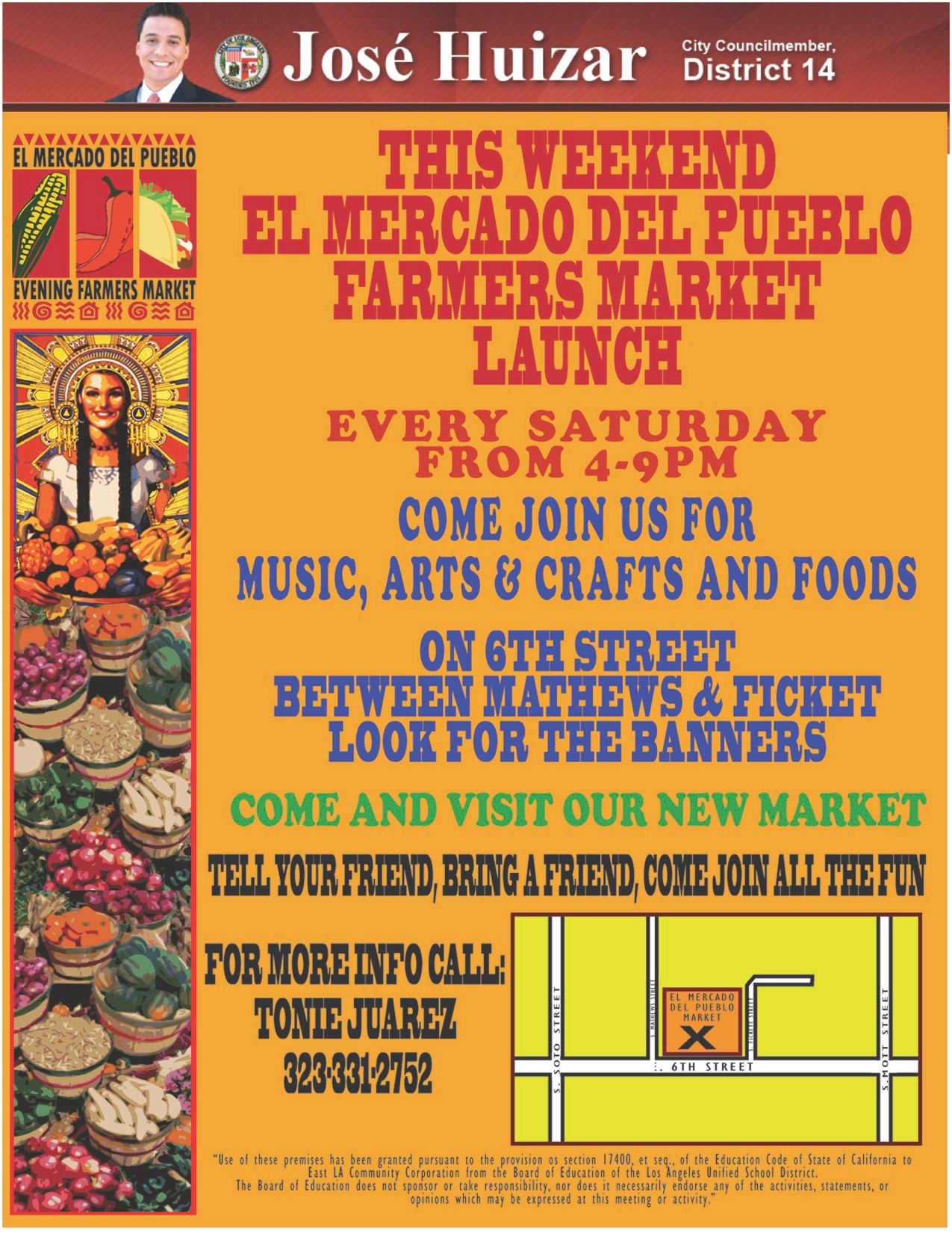 The Boyle Heights non-profit East LA Community Corporation (ELACC) and Los Angeles City Councilmember Jose Huizar are celebrating the grand opening of El Mercado del Pueblo,a one-stop evening farmers’ market with crafts, produce, hot food, and live music. The market will include local street food vendors offering their delicious foods including tamales, tortas, crepes, and other crafty treats. The market kicks off on Saturday, September 1 and that will take place every Saturday.