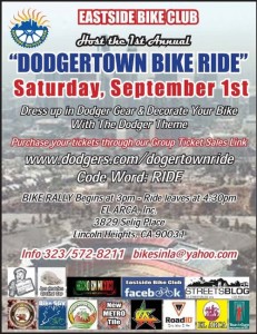 The event starts with a Bike Rally at 3 p.m. The rally features a best decorated “LA Dodger Fan and Bike” theme. Participants are encouraged to wear Dodger attire and decorate their bikes. A Bike Parade (ala Soul Train Line), with prizes being awarded for best decorated bikes and riders. Music, raffles, health and bike related resources will also be present.