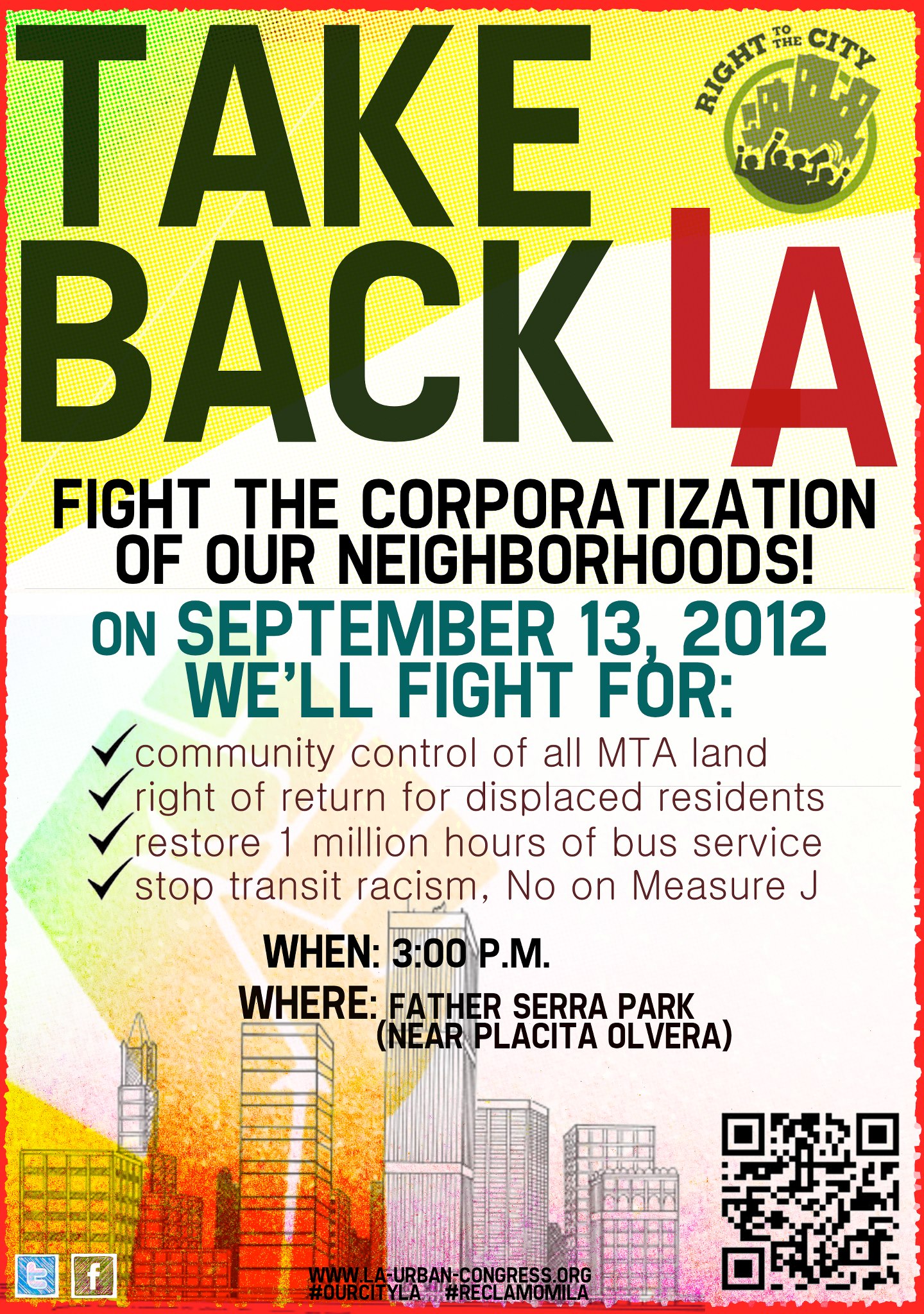 City and neighborhood groups will march from Downtown L.A. to Boyle Heights tomorrow to protest Metro’s control of property in low-income areas and to undo cuts to bus services. Organizers expect more than 400 people to march from Father Serra Park, near Placita Olvera, to Mariachi Plaza in Boyle Heights, according to a press release.