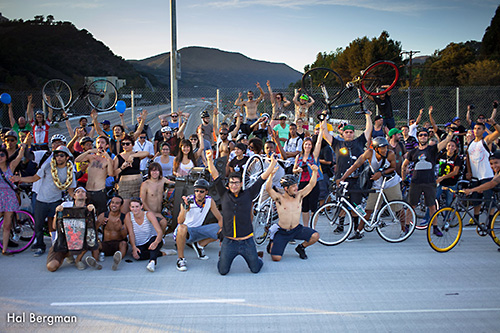 Though modest in pace, the Carmaheaven ride was several hundred strong, and fairly epic in scope. The ride started at the new Grand Park in Downtown Los Angeles, after feeder rides and transit riders came from as far away as Pomona. The ride included a viewing of the 405 at the Sunset bridge (pictured above), and concluding with a nighttime bonfire at Dockweiler Beach under a full Harvest Moon. The fact that a major automobile artery is shut down feels like a holiday, one that locals bars even name mixed drinks after, does say something about a shift occurring in the culture.