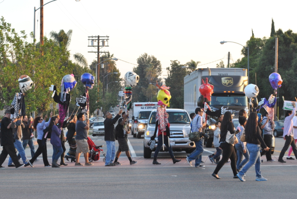 Around 5 p.m., calavera face-painted people, bicyclists, and paper machete puppets gathered at the west edge of the mariachi plaza celebration for Self Help Graphics and Arts Day of the Dead procession. After a brief ceremony, the group walked along the First Street sidewalk to SHG&A.