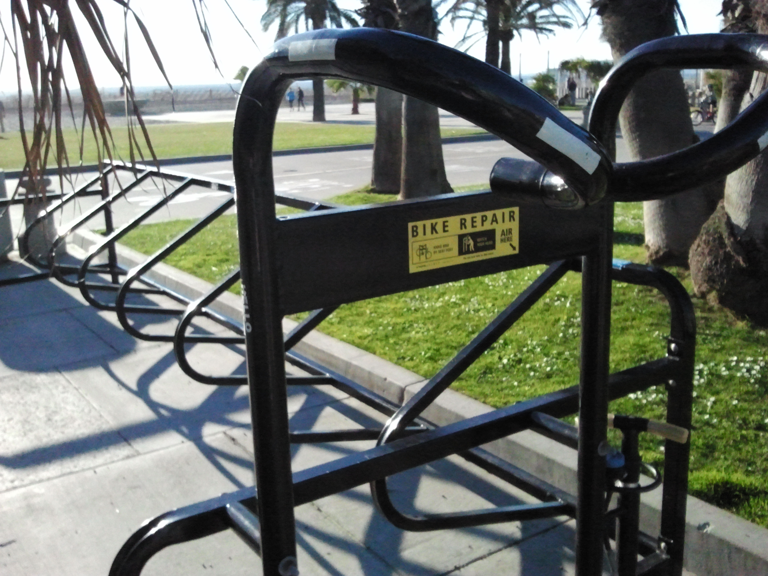 Then there’s the new combination bike rack/repair stand I noticed across from the playground on the beach bike path yesterday; I’m not sure when it was installed, although it’s been there long enough to get tagged on the opposite side.