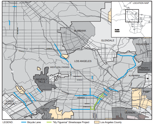 The Draft EIR covered 39.5 miles of bicycle lane projects that would require the removal of parking or a mixed use travel lane in areas where the Level of Service was already a C, D or F and the My Figueroa! project which covers 3 miles of Figueroa and some connecting streets in South Los Angeles and promises major streetscape, transit and bicycle access improvements. Just because a projet doesn’t appear on the list below doesn’t mean that it isn’t on the construction list, just that it wasn’t part of this study. Not every bike project needs to be studied under CEQA or A.B. 2245.