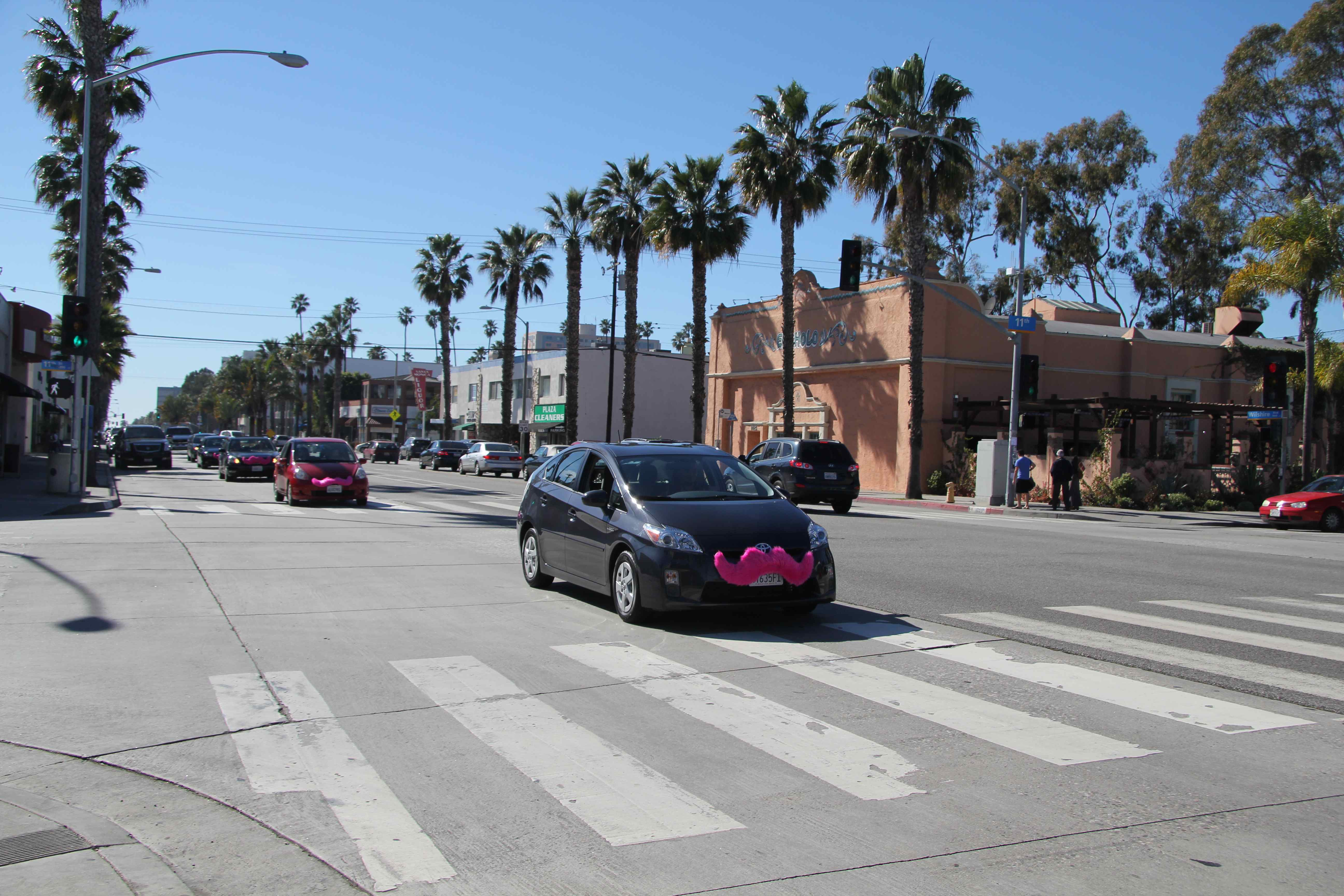 As part of its Los Angeles launch, Lyft led a parade of cars donning fluffy pink mustaches on their front bumpers through the streets of Santa Monica during the lunch hour today.