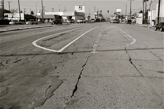 South of Gage, where the road widens to three lanes and a separated business lane, speeds pick up just as the conditions worsen for everyone. During the day, a cyclist can generally manage to avoid potholes, cracks, and random palm frond debris while dodging cars. Things get dicier at night, however, when it is harder to see the depth of the cracks or the height of the moguls and you are more likely to be unexpectedly thrown off balance, possibly into traffic.