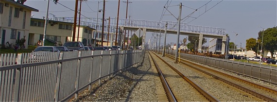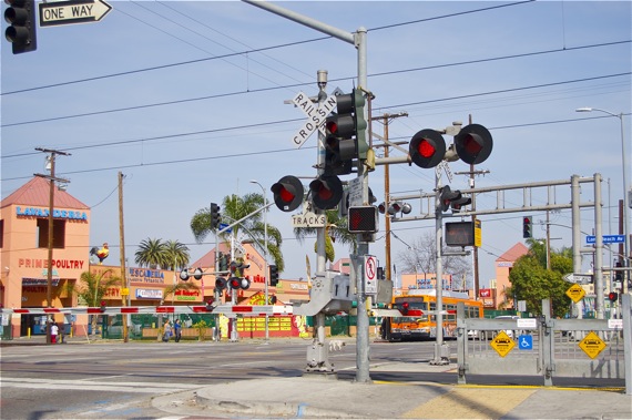 One or two sets of Union Pacific rail tracks run alongside the Blue Line tracks for much of its trajectory. Because Union Pacific manages thousands and thousands of miles of tracks, they have been reluctant to supply their South L.A. crossings with anything more than the most basic of safety measures.