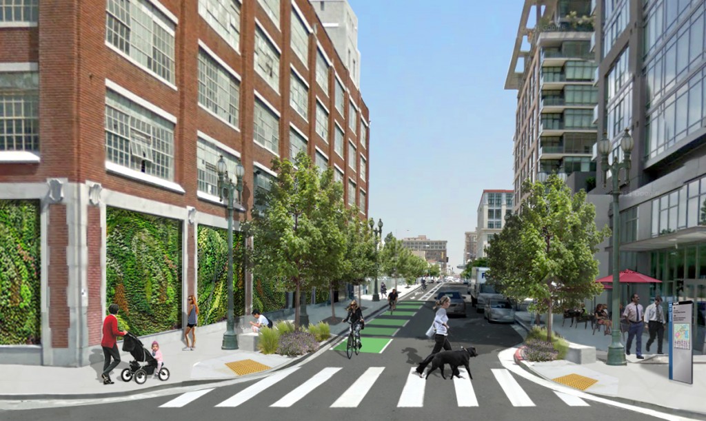 “While our design still includes cycletracks on Fig, as we have always shown, we have more to share about the design of the entire corridor, and the multimodal components serving pedestrians, cyclists and transit riders,” writes Melani Smith, the president and principal of Melendrez Design Partners, the firm who has teh lead on the project. “We think there’s something in our design for all kinds of people using the streets. Ultimately, we’re planning a corridor that is a safer, more comfortable place for people to be.”