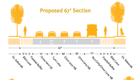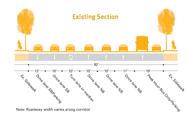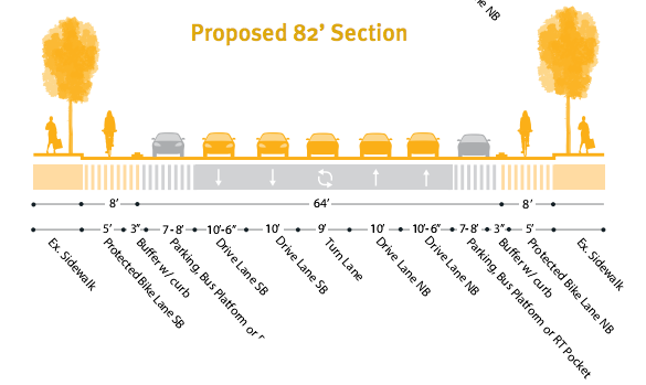 On the south side of the street, the physical configuration of the sidewalk cannot be changed, but paving will be repaired and lighting improved as needed and possible. Transit waiting areas on both the north and south side of the street will be improved as needed, and to the extent that space constraints allow, and connections across the street facilitated by highly visible crosswalk striping.