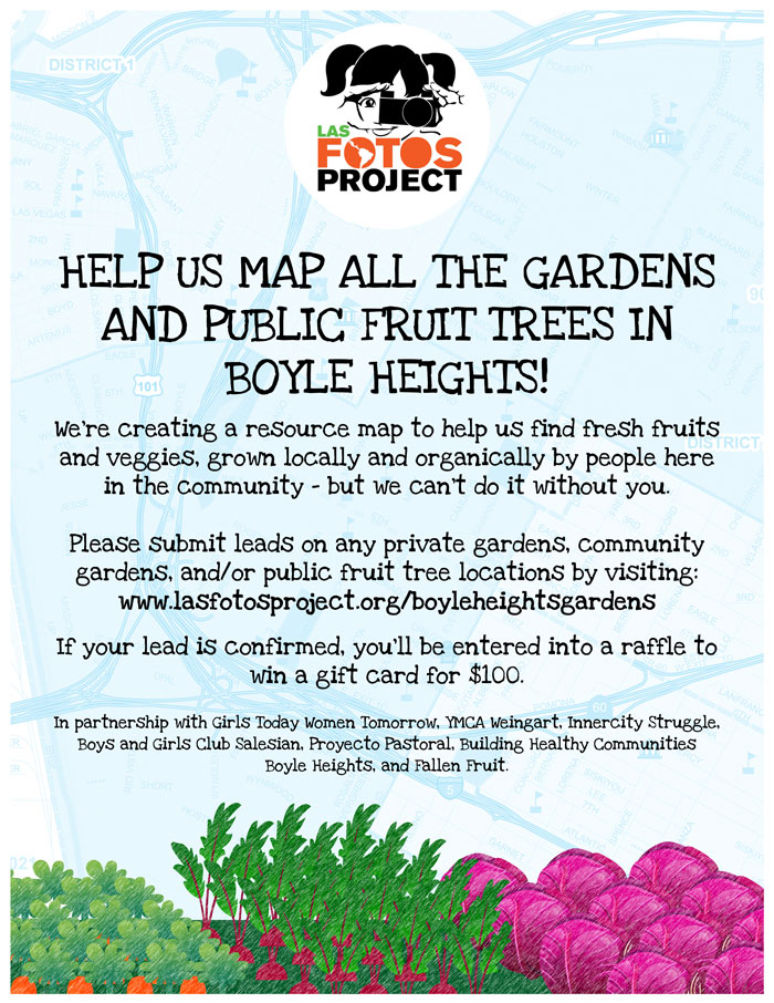 “Las Fotos Project’s student photographers are creating a resource map with all the gardens and public fruit trees for the community of Boyle Heights,” writes Natalie Franco, a professional advisor and advisor for this project. “We need your help! Please submit your leads to any gardens or public fruit trees here: www.lasfotosproject.org/boyleh