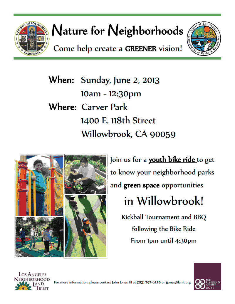 Sunday, the United Riders of South L.A. (the superhero identity of the East Side Riders and Los Ryderz) will be leading a bike tour through Willowbrook to point out green opportunities in the community. Participating in the tour will be staff from L.A. County Parks and Recreation, the Los Angeles Neighborhood Land Trust, and The Planning Center – DC&E to help ensure that opportunities translate into action down the road.