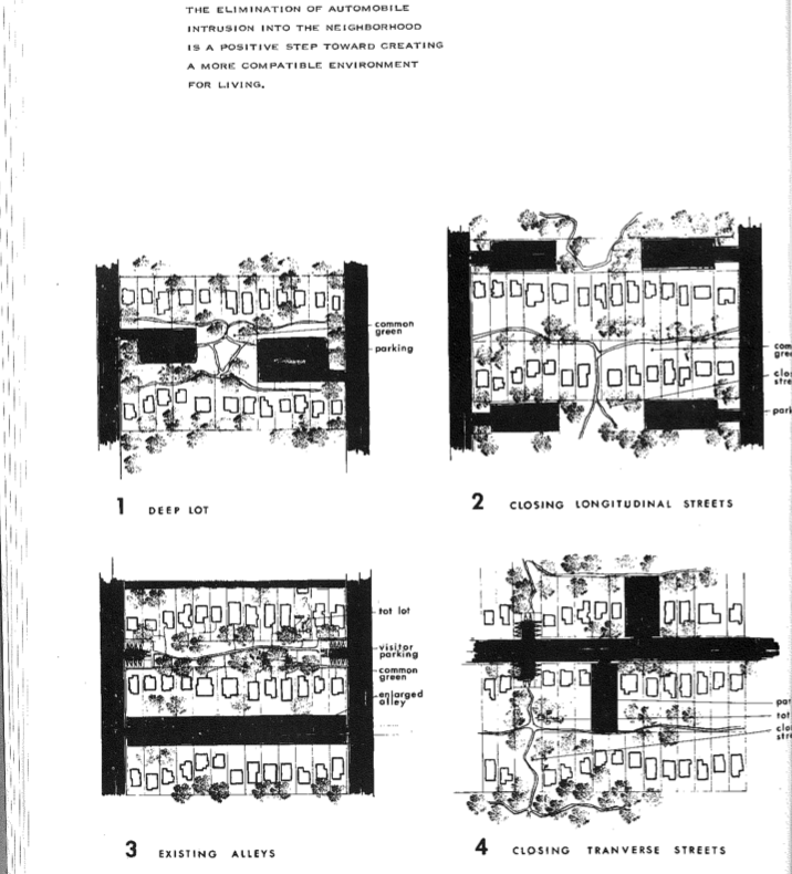 - Divert or calm vehicle traffic from residential streets to make them safe routes for cycling and walking. The City’s bike 2010 plan includes a neighborhood network of traffic calmed streets to allow people who are not comfortable riding on boulevards to ride safely through residential areas. A variety of interventions are discussed in sections 4.4 to 4.11 of the plan’s Technical Design Handbook. Some of these, especially diagonal diverters to close some intersections to vehicles while allowing cyclists to proceed, have the potential to make biking much more convenient and safe. In 1969, the Southern California Chapter of the American Institute of Architects wrote a report for the City of LA Planning Department that included concepts for the “elimination of auto intrusion into the neighborhood” by eliminating parts of streets so the center or end of through blocks could be repurposed as pedestrian, bicycle and open space (see image). Combined with neighborhood-serving businesses, redesigned streets can hopefully make single family neighborhoods safer places for all residents and decrease driving for short to medium distance trips.