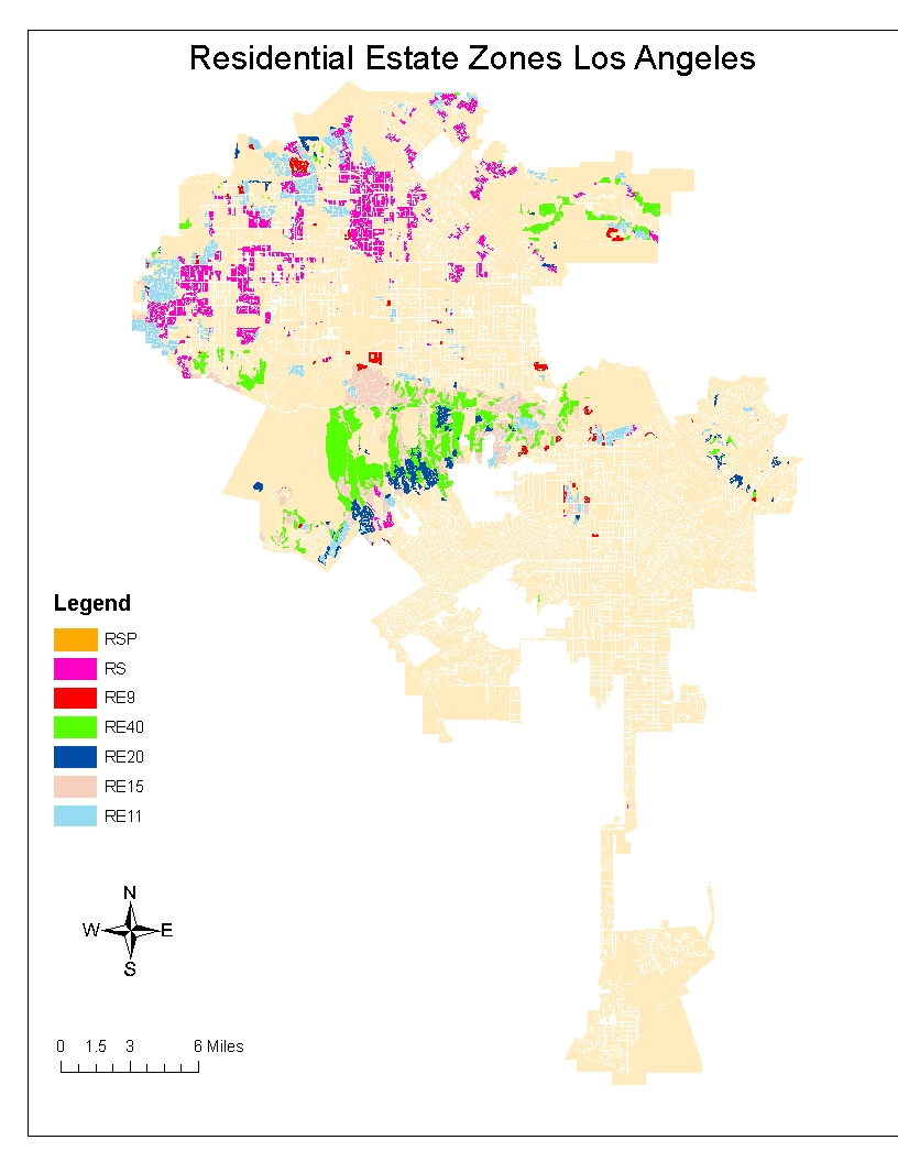 Large single purpose zones make it difficult for people to walk to the services and amenities they need to access on a regular basis. Low-density residential zones also make it difficult to serve residents via transit. According to an oft- cited report by the Institute of Transportation Engineers, Infrequent bus service (every 30 minutes) requires residential densities of approximately 7 dwellings per acre. More frequent service (every 10-15 minutes) requires approximately 15 dwellings per acre. Most single- family zones in Los Angeles have minimum lot size of 5000 square feet which works out to 8 dwelling per acre if all homes have minimum sized lots. The city also has Residential Estate zones with increasingly larger minimum lot sizes.