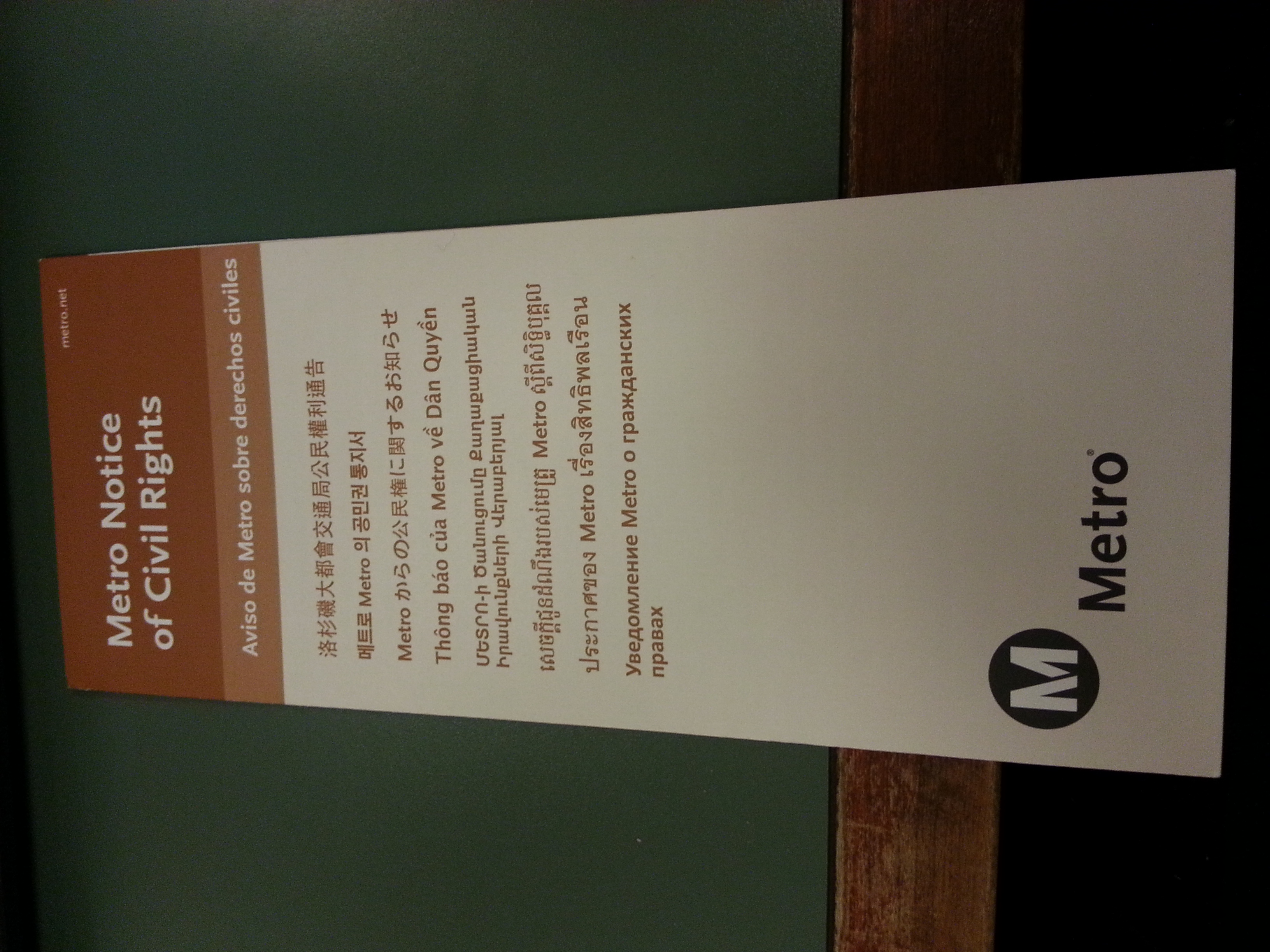 A few months ago I spotted on the bus a new take one multilingual brochure titled “Metro Notice of Civil Rights”. Informational placards with the same information also popped up on Metrorail equipment. I recognized this as the latest component of the actions Metro has undertaken to satisfy the Federal Transit Administration (FTA) regarding its obligations under what is known as Title VI when making changes to service or fares.