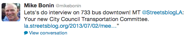 We have to give Bonin some credit here for his transit bonafides, not only did he tweet his bus ride to work (something he does regularly), but he managed to turn it into a press story. Good work.