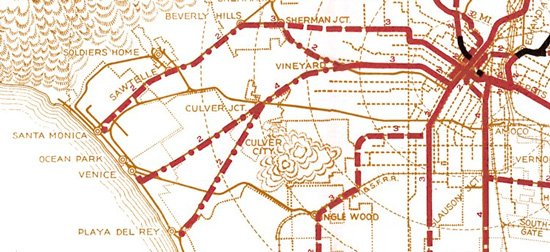 Also among Santa Monica futures that could have been were connections to other parts of the region by one or more rapid transit lines or subways, that could have potentially been operating by now for sometime. Of course there already were the Pacific Electric streetcar lines that had operated for so long and later abandoned after the car boom and freeways, but faster transit service along major routes were proposed going way back, and intended to be unimpeded by the congestion of cars through elevation or going underground. The Expo Line will be running in 2016, and who knows when the Purple Line Extension may get to Santa Monica (Measure R isn’t enough to get it all the way to coast), but proposals to bring rapid transit beyond the street car era to Santa Monica were being drawn as lines on maps as far back as 1925, and revisited over and over again for decades, rejected over and over, until finally a new rail era began in the 80’s after enduring years of choking traffic and thick smog.