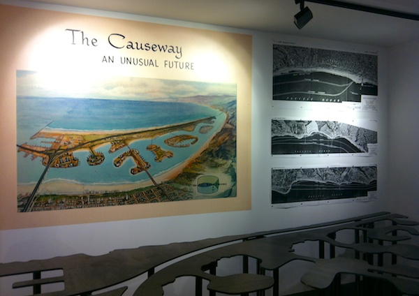 One of the most striking displays in the entire exhibit, and right near the door, is a display of the Santa Monica Causeway, a plan that started being hashed out in the early 60’s. There is a painting, unmistakably Santa Monica, but looming out in the bay sits a clustering of alien islands propping up a 200 ft. wide freeway connecting the 10 freeway to Malibu. Perhaps more than any other single proposal that never happened, the sight of the Santa Monica Causeway immediately drew responses at the gallery opening of relief, that this plan was only ever on paper (and a scale model that apparently vanished mysteriously). Such a grandiose alteration of one of the most popular stretches of California coastline views, with a suspended freeway zooming cars over the water, is pretty difficult to fathom now.