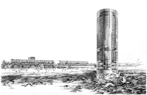 The causeway wasn’t the only failed offshore proposal with ambitions to develop directly in the Santa Monica Bay. Also featured in the Neverbuilt exhibit was a development proposal from the developer John Moreheart, who had bought out the former Pacific Ocean Park pier, and commissioned an architectural plan for glass cylinder 600 room hotel with 360 degrees of continuous views of the ocean, coast, and city lights, that would literally rise straight out of the water. It was to be connected to land by a glass enclosed moving sidewalk over the waves, in what I could easily imagine appearing as some religious reenactment for every guest. The project tanked for lack of funding, and the developer, who was found to owe significant back taxes, lost the former pier property site as part of a swap the property was taken back into city control to become the open beach in front of Ocean Park Blvd today.