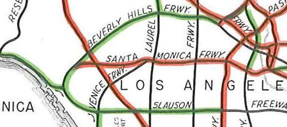 The Los Angeles region had instead come to be so often defined and shaped around it’s freeway grid, and the I-10 became the pipeline to the beach, but there were also many more possible freeway corridors than we have today. Some were proposed and planned but fell through under public frustration, political freeway backlashes or cost overruns. The Santa Monica Freeway left a serious scar and wide dividing line through Santa Monica’s Pico Neighborhood, but cutting up Santa Monica and it’s surroundings some more to create connections to a ‘Venice Freeway’ and ‘Beverly Hills Freeway’, were in the cards in the 1958 Freeways And Expressways master plan, along with many other slated freeways that were to trample elsewhere through the region, some that did get built, or partially, and some that did not.