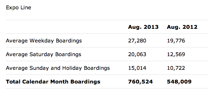 Yesterday, Metro announced that the Expo Line averaged 27,280 boardings every weekday, meeting its 2020 ridership projections a mere seven years ahead of schedule.