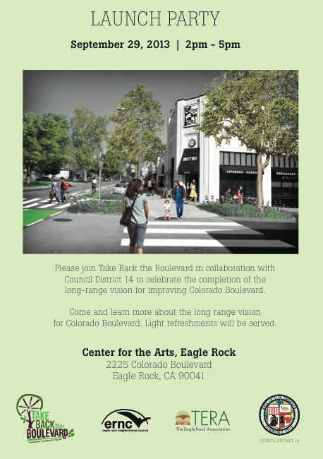 Take Back the Boulevard has engaged in a 2-year-long community planning process to develop a long-range vision for Colorado Boulevard in Eagle Rock. The overarching vision is to give Colorado Boulevard more of a “main street” feel. Central to that is shifting Colorado Boulevard away from an emphasis on moving cars toward a more balanced treatment for all travel modes, including new bike lanes and improved pedestrian crossings.