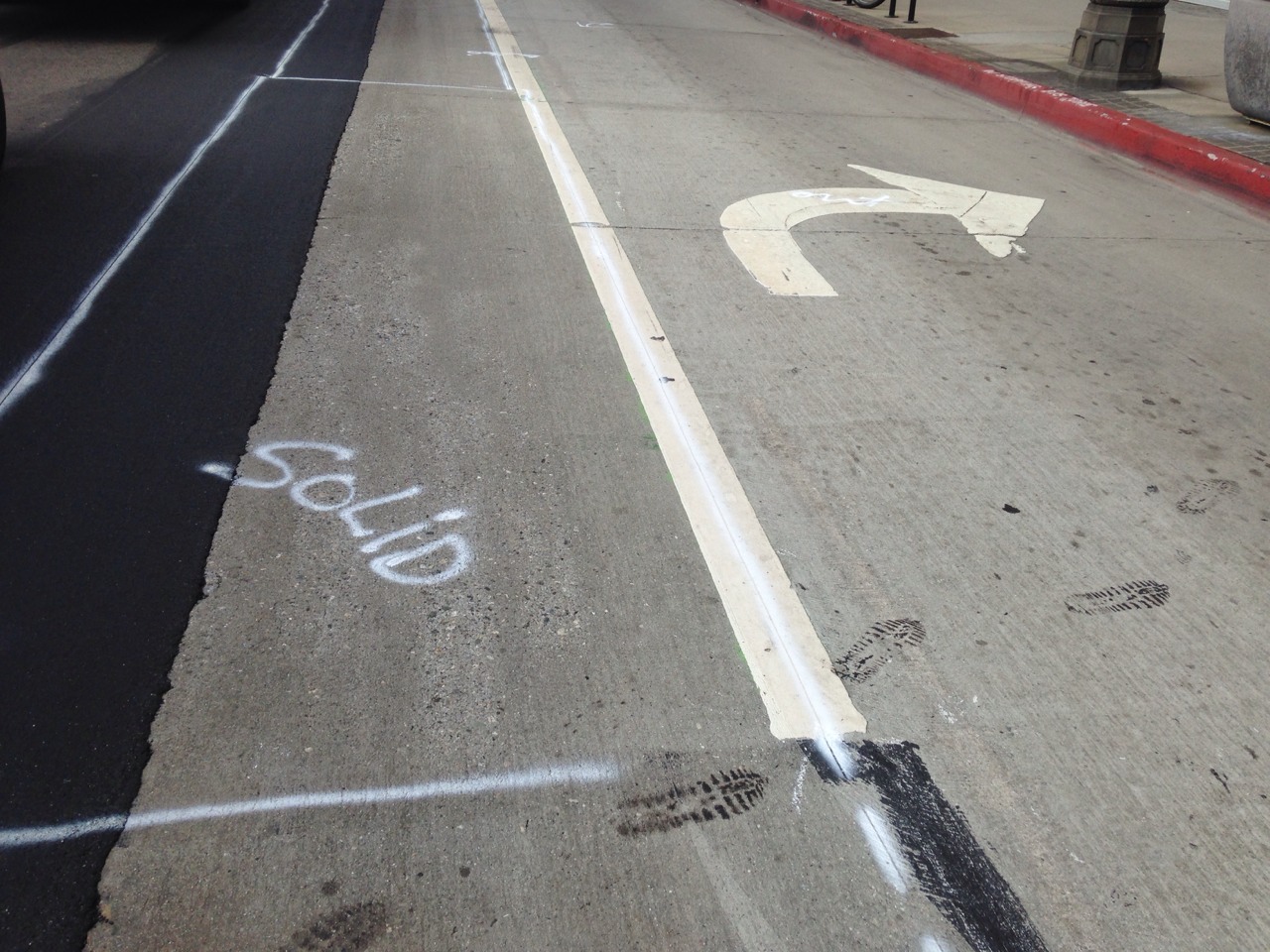 Some readers informed me this morning that there was some new paint on the ground (“It looks horrible,” more than one of you bemoaned.) but the department assures me that this is the first of a three step process. They wanted to do the painting at night so it wouldn’t disrupt the daytime traffic and would be dry by morning.