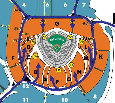 According to the Dodgers press office, racks are available at seven places around the stadium. In 2008, a single bike area existed near the south portion of the stadium where one could chain their bike on security gates that also served as the smoking area. Security were untrained on the location of the racks and the only map that existed was made by Streetsblog.