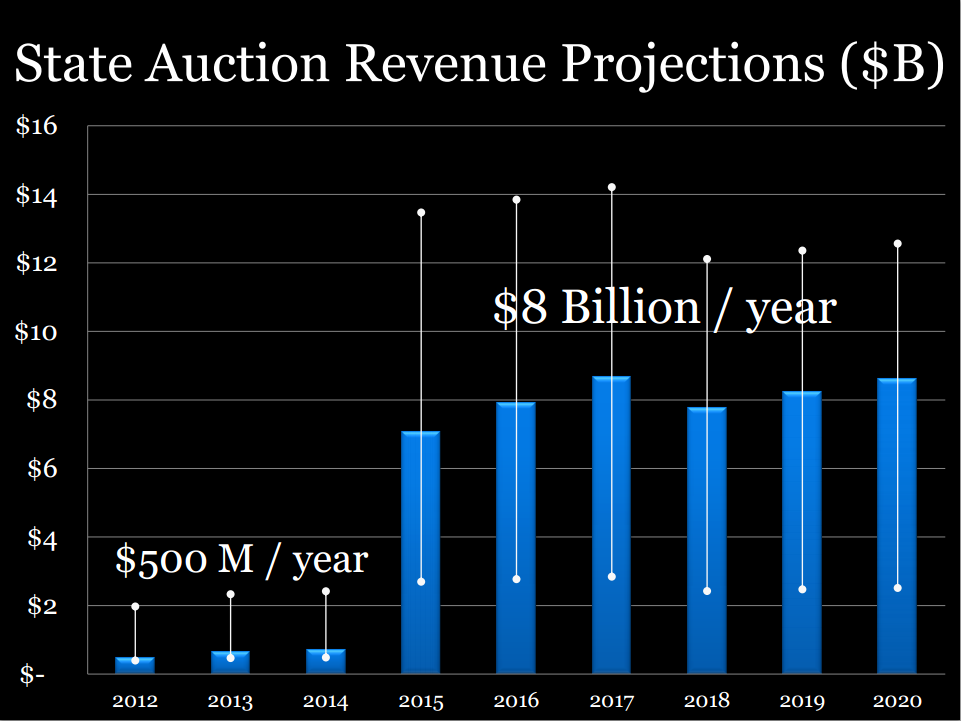 California’s landmark 2006 climate change law, AB 32, seeks to reduce the state’s greenhouse gas (GHG) emissions to 1990 levels by 2020, and 80 percent below that by 2050. The law includes a comprehensive portfolio of GHG reduction measures, one of which is cap-and-trade — a cap on overall emissions in certain industrial sectors paired with a system of tradeable emissions allowances under the cap. The state will distribute some of the allowances by selling them at quarterly auctions. A great summary of cap-and-trade can be found here.