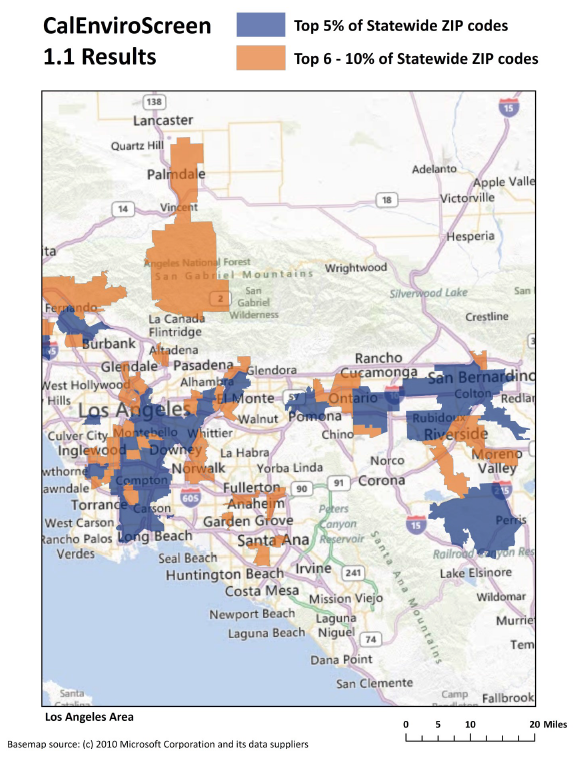 The state Environmental Protection Agency (CalEPA) has been using its CalEnviroScreen mapping tool to identify the communities in which the proceeds should be spent. A large proportion of the highest-scoring ZIP codes (pdf link) lie within LA County, mainly within industrial corridors and in inland valleys where topography tends to exacerbate regional air pollution.