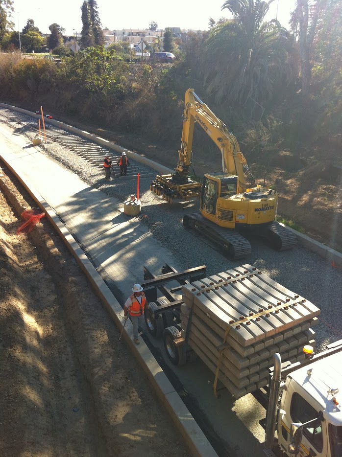 On Tuesday, Jonathan Weiss snapped this picture of the Expo Line tracks being placed in the Northvale Road trench. The trench runs along the southern end of Cheviot Hills and the track’s arrival is considered a construction mile stone by rail fans.